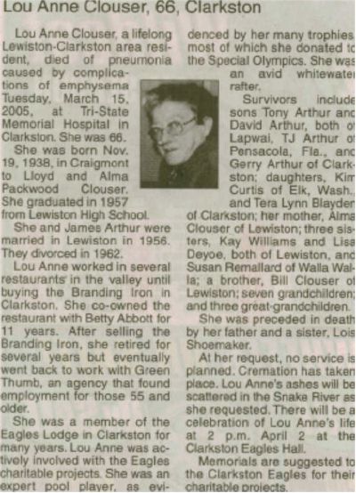 Lou Anne Clouser, 66, of Clarkston died Tuesday March 15, 2005 at Tri-State Memorial Hospital in Clarkston.